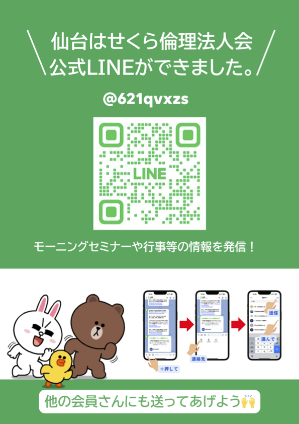 仙台はせくら倫理法人会の公式LINEができました。友だち登録がお済みでない方は下記 リンクよりご登録よろしくお願いいたいします。